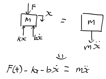 - 자유물체도에서 외력 F와 그 반대로 작용하는 두힘 kx와 bxdot이 균형을 이루지 못하는 경우