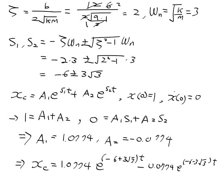- 댐핑비 > 1(과도 감쇠), m = 1kg, b=12Ns/m, k=9N/m, x(0)=1, xdot(0)=0