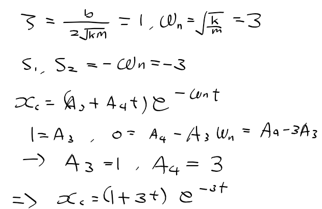 -> m = 1 kg, b = 6Ns/m, k=9N/m, x(0)=1, xdot(0)=0
