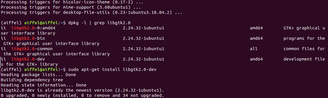 설치도 잘 됬고, dpkg로 libgtk2.0-dev가 깔린걸 확인할 수 있었다.