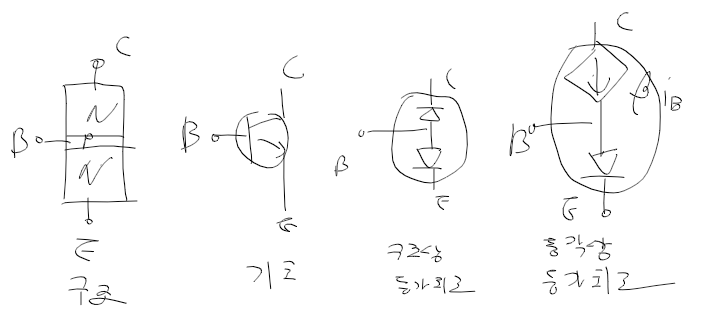 - 이미터로 전자가 주입되고, 이미터의 전자가 컬렉터로 이동하는 중 일부는 베이스의 홀과 재결합하여 사라짐.