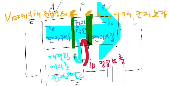 =>B-E에 순방향 바이어스를 인가하면 전자 이동을 막고 있는 전장 E_BE를 줄일 수 있다.
