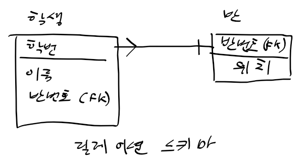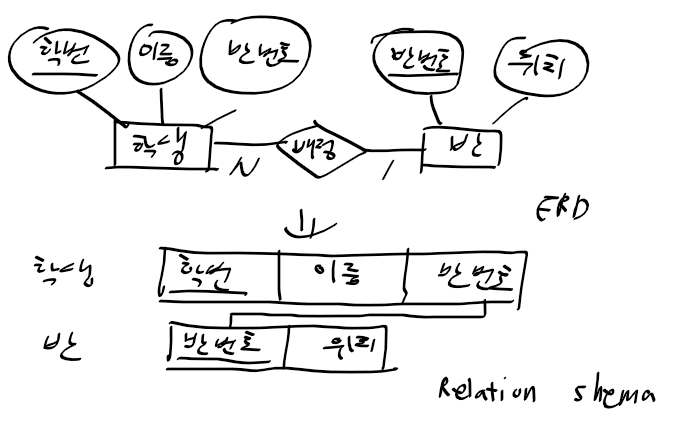 - 학생과 반 개체의 1:N 관계를 릴레이션 스키마로 표현