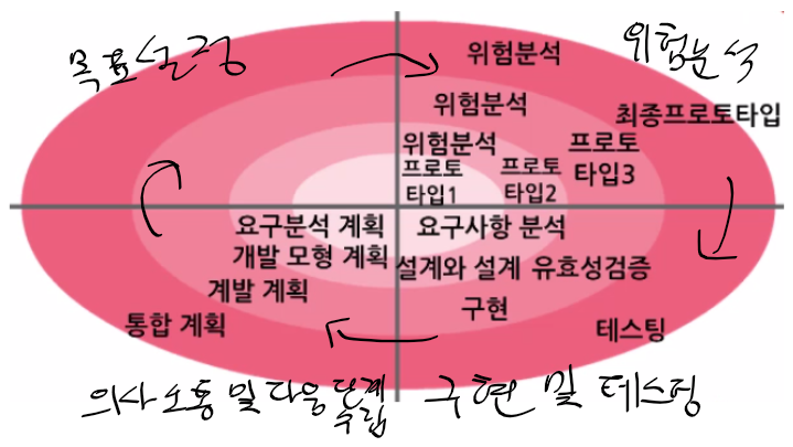 - 개발 중 위험 최소화 하기 위해 나선을 돌면서 개발해나감