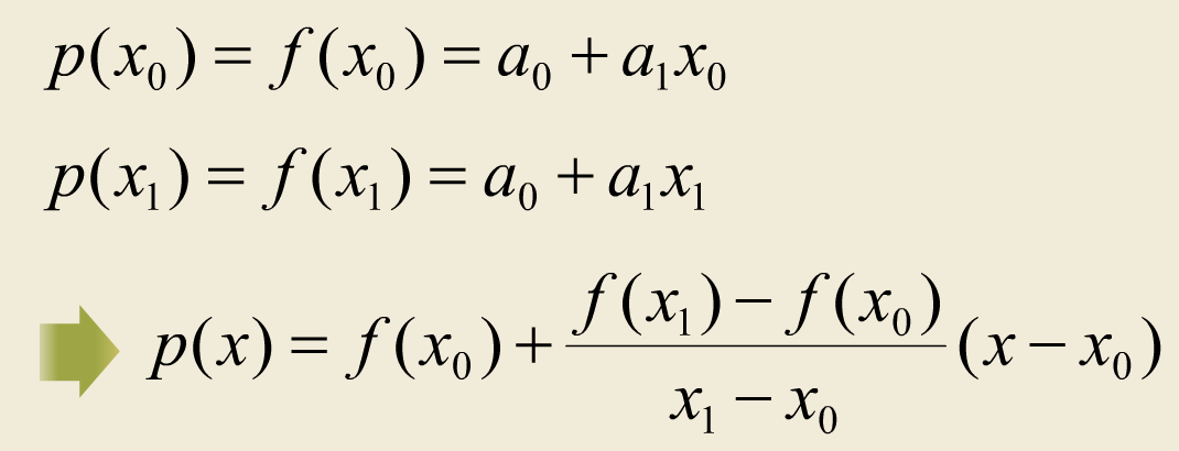 - 서로 다른 두점 (x0, y0), (x1, y1)을 지나는 다항식은 많으나 그 중 1차 다항식(직선) y = ax + b, 하나만 존재