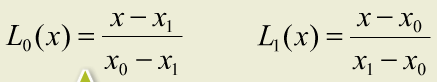 - L_0(x)는 (x0, 1), (x1, 0)을, L_1(x)는 (x0, 0), (x1, 1)을 지나는 1차 다항식은 다음과 같음
