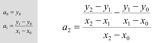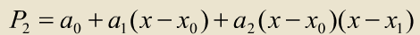 계수 a_0, a_1, a_2를 구하기 위해 P_2(x_0) = y_0, p_2(x_1) = y_1, p_2(x_2) = y_2 이므로 다항식에 대입하면
