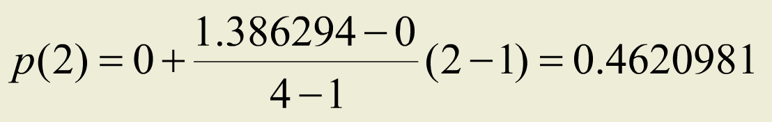 - ln 1 = 0 과 ln 4 = 1.3862944 사이에서(점 사이 간격이 작은 경우) 다음과 같이 계산