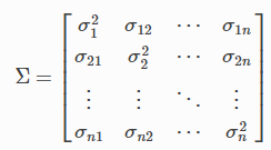 이제 다변수 정규분포의 공분산을 공분산 행렬 covariance matrix를 사용해서 다음과 같이 나타내겠습니다.