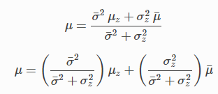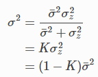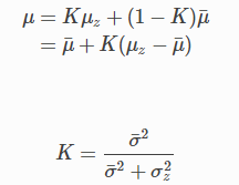 K는 칼만게인이라 하며 측정치 $\mu_z$와 예측 평균 $\bar{\mu}$ 사이 값을 얼마나 반영할지 스케일링하는데 사용됩니다.