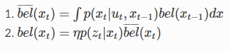 칼만 필터의 기본 구조와 컨셉은 베이즈 필터와 동일합니다. 다만 차이점은 칼만 필터의 수학적인 표현법인데, 칼만 필터는 가우시안을 이용한 베이지안 필터가 아닙니다. 베이즈 필터를 칼만 필터에 적용하기 위해서 가우시안을 히스토그램이 아닌 방법으로 나타낼건데, 베이즈 필터의 기본 공식은 다음과 같습니다.