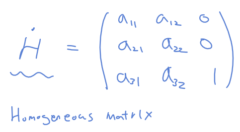 - 동차 좌표 homogeneous coordinate와 동차 행렬 homogeneous matrix을 이용하여 기하학적 변환(연산)이 수행된다.
