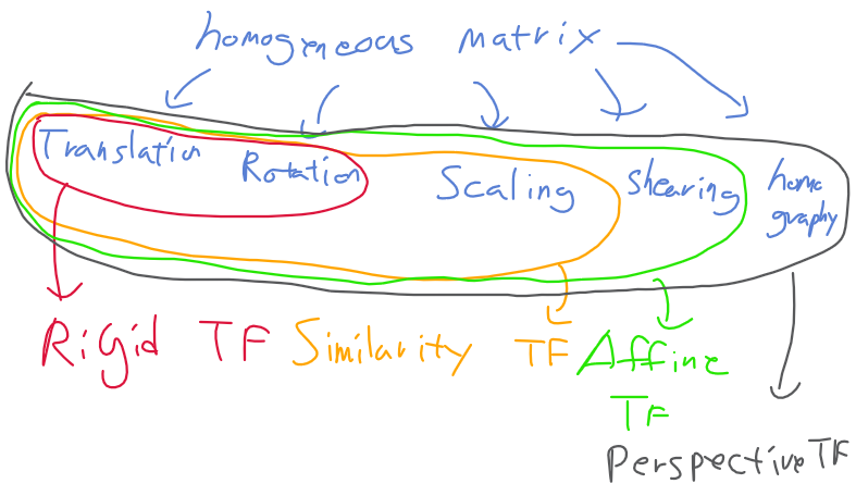 - 강체 변환 rigid transform : 평행이동 + 회전
