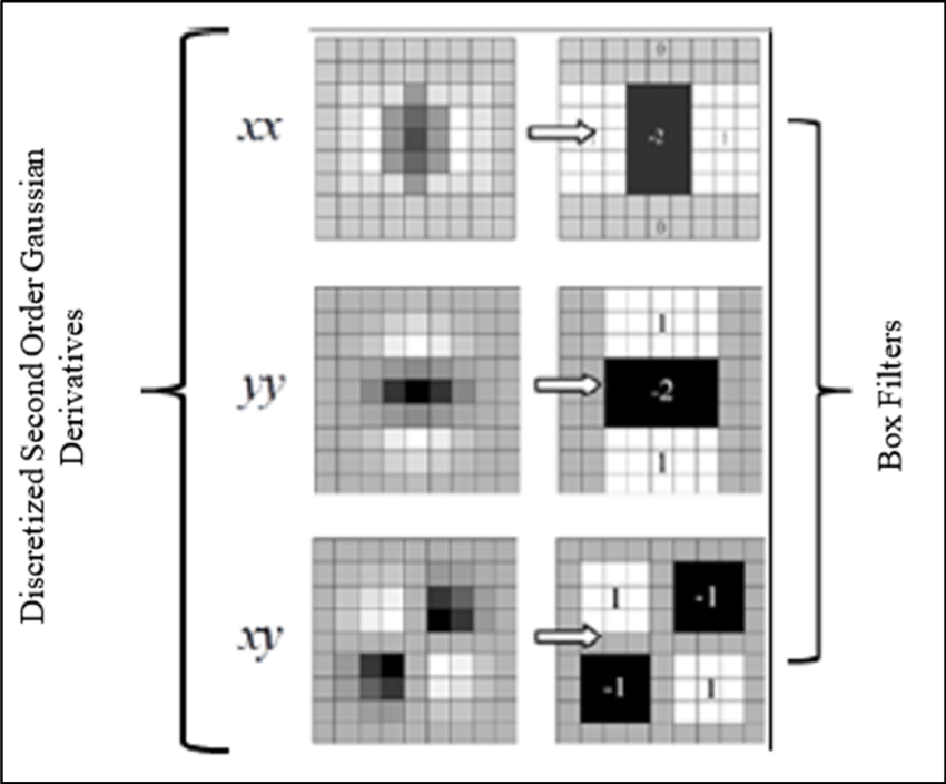 - 4개의 옥타브에 대한 박스 필터를 사용하여 검출한 특징이 SURF