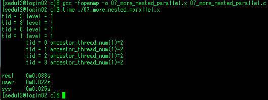 printf("\ttid = %d ancestor_thread_num(%d)=%d\n", tid, level, omp_get_ancestor_thread_num(level) );
