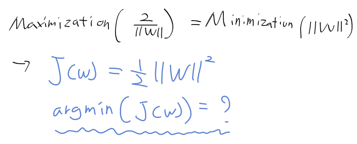 - 여백 margin을 최대화 화는 결정 초평면의 기울기 w를 구해야 함
