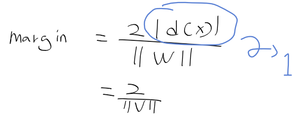 - 결정 경계 decision boundary와 서포트 벡터까지의 거리가 1이 되도록 한다면 다음과 같이 정리 가능