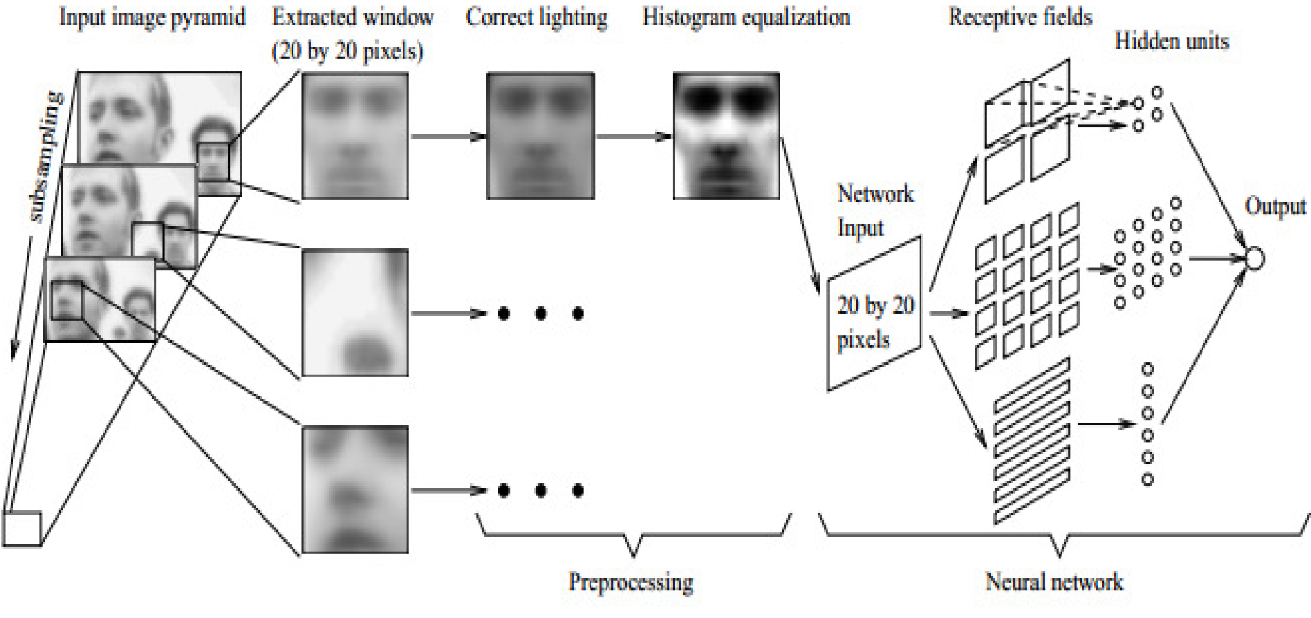 * 윈도우로 전처리 -> 신경망 입력 -> 얼굴 여부 판단