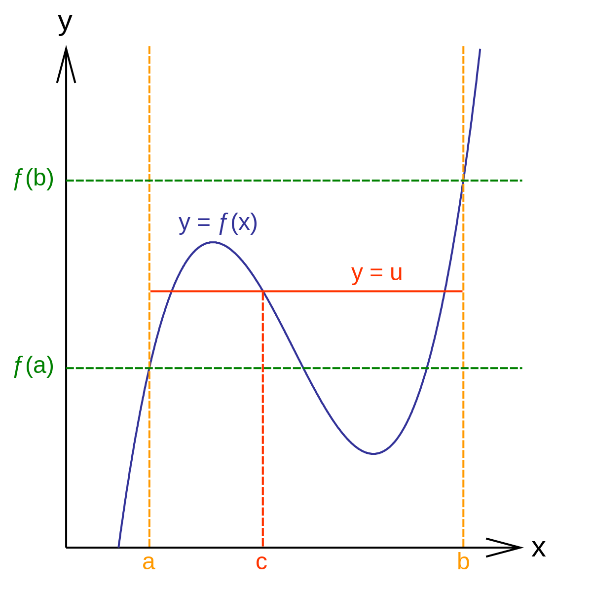 - 중간값 정리 : f(c) = u인 c가 닫힌 구간 [a, b]에서 적어도 하나는 존재