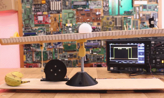 시소 처럼 생긴 구조물 끝에 초음파 센서와 공을 놓고