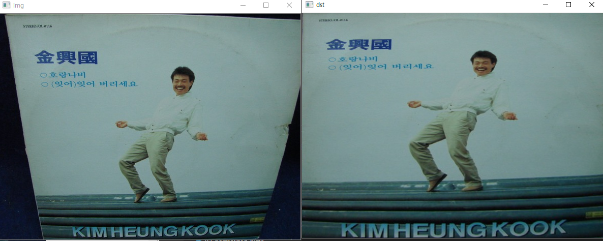 - 그러고 나서 cv2.warpPerspective 함수로 아까 구한 변환 행렬을 사용하면 원근 변환된 이미지를 얻게 됩니다.
