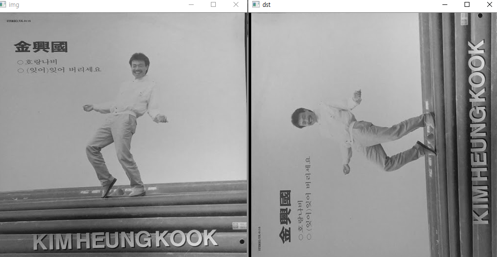 - cv2.getRotationMatrix2D 함수로 위와 같은 회전 변환 행렬을 얻을 수 으며 스케일링 없이 90도 회전한 결과는 아래와 같음