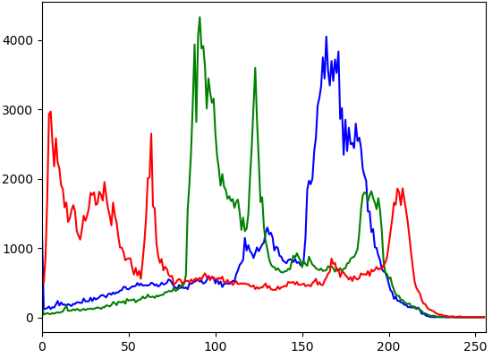histr = cv2.calcHist([img],[i],None,[256],[0,256])