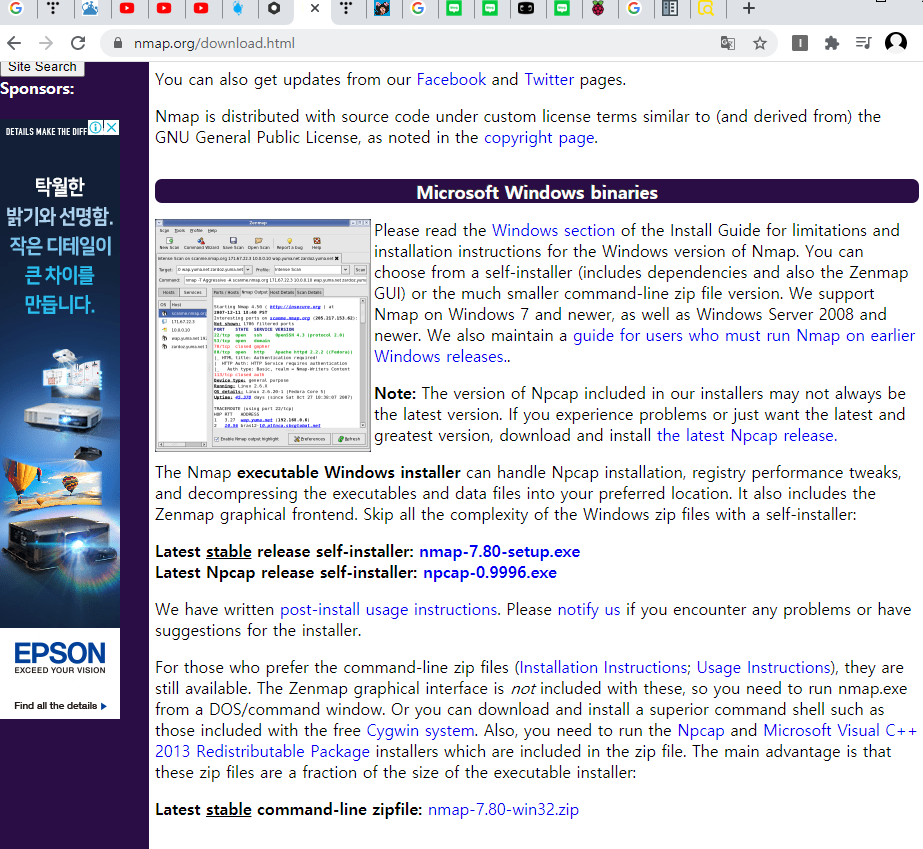 nmap 홈페이지에서 다운, 설치부터 해주고