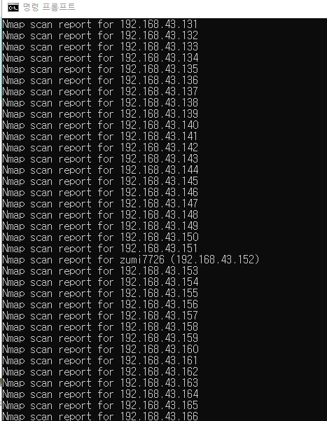 일단 같은 네트워크에 존재하는 호스트들을 스캔하기전에 내 IP 주소부터 CMD에서 확인해줍시다