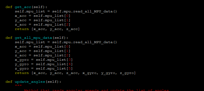 지난번에 추가한 get_acc 함수 밑에 넣어주면 이제 가속도, 자이로 전체 값을 사용할수 있게 됩니다.