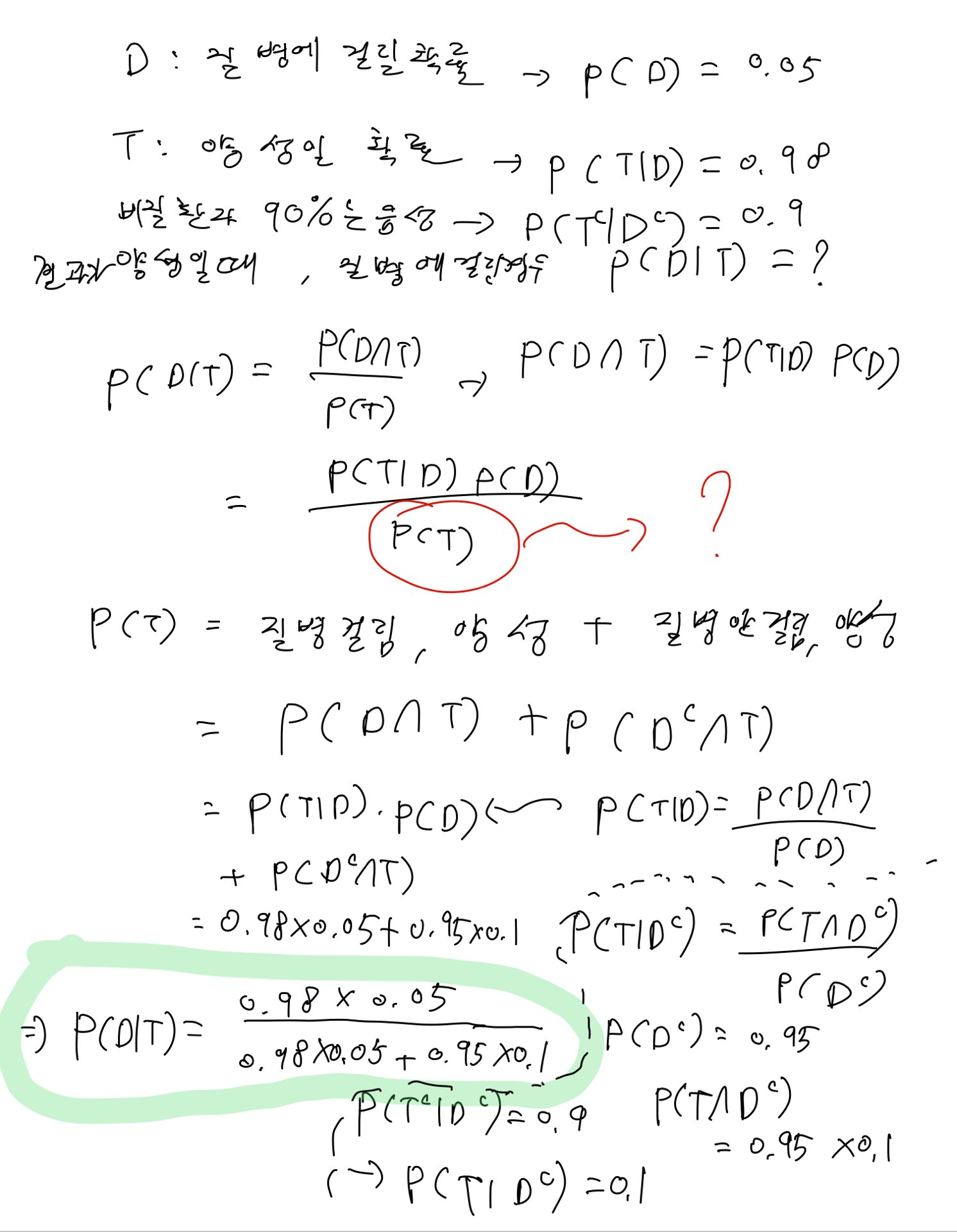 - 진단 결과가 양성일때 질병에 걸릴 확률
