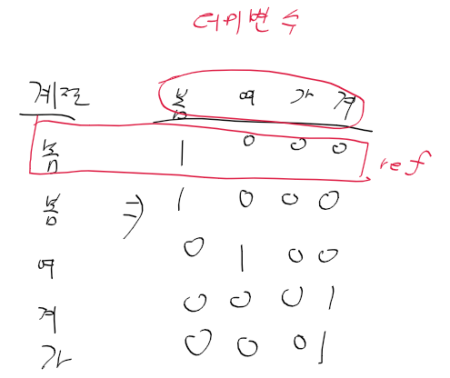 - 범주형 변수를 연속형 변수처럼 만들며 0,1의 값을 가짐