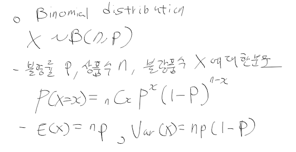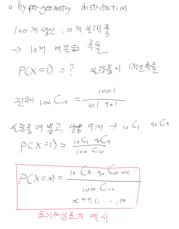 - 초기하 분포 : 2개의 군으로 구성된 모집단에서 표본을 비복원 추출시 분포. ex 불량품 갯수