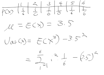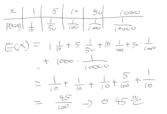 - 기댓값 expectation : 확률 변수 평균. 중심의미의 지표