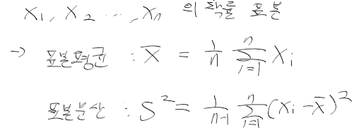 - 정규 분포 N(mu, sigma^2)인 모집단에서 n개의 확률 변수 X1, X2 ..., Xn