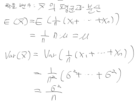 3. 표본 평균을 새로운 확률 변수로 보자 -> 표본 평균의 평균과 표본 평균의 분산을 구할 수 있음.