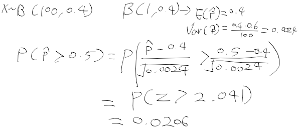 - 모집단 흡연 비율 0.4인 학생 100명의 흡연 여부조사시. 흡연 비율이 50%보다 클 확률