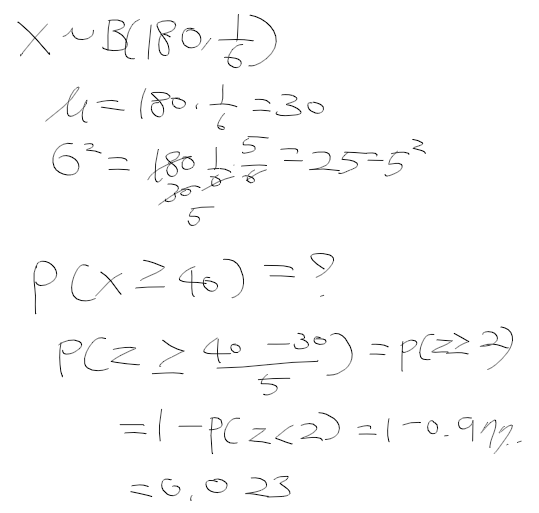 - 주사위 180번 던질떄 6이 나올 획수가 40이상일 확률
