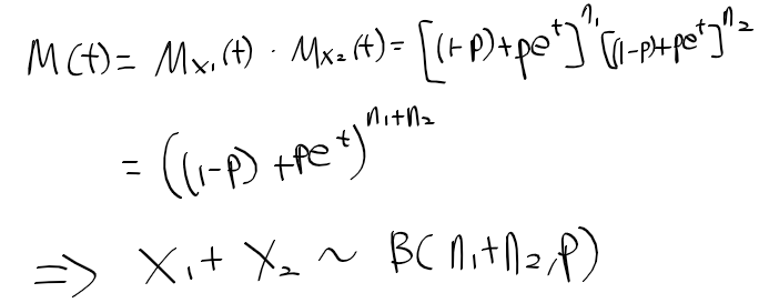 - X_i ~ B(n_i, p)의 경우 X1 + X2의 확률 분포를 구해보자