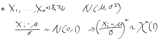 - 정규 분포를 따르는 확률변수 Xi를 표준화 하고 제곱하면 자유도가 1인 카이제곱 분포를 따르게 된다.