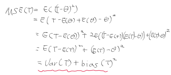 - 통계량 T에 대한 평균 제곱 오차를 편향과 분산으로 나누면 다음과 같다.
