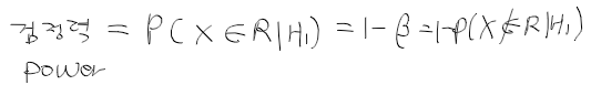 - 검정력 : 대립가설이 참일때 귀무가설을 기각할 확률