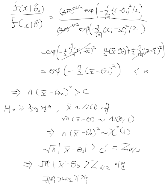 - H0: theta = theta0 vs H1: theta != theta0에 대한 유의수준 alpha에서 가능도비 검정을 구하자