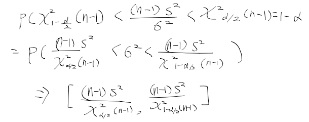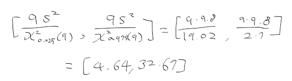 - 모집단이 정규분포를 따르고, 표본크기가 10, 표본분포 S2 = 9.8인경우 sigma2에 대한 95%신뢰구간