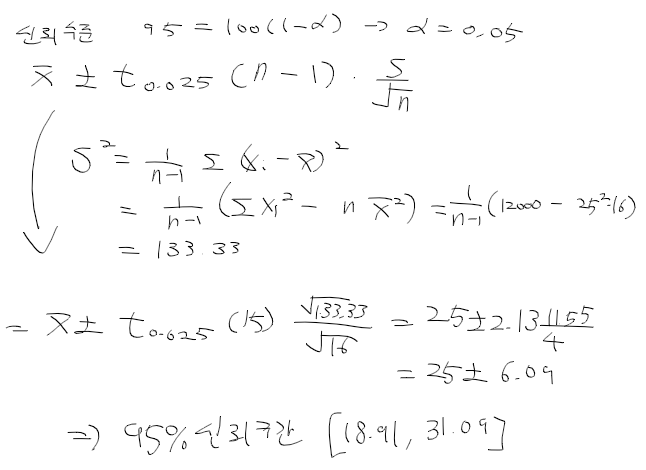 - 모표준편차가 알려져있지 않을때, 모평균에 대한 95% 신뢰구간 구하기