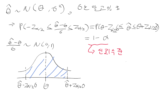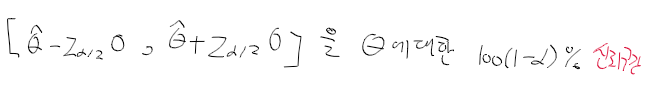 - 95% 신뢰구간 : theata에 대한 95% 신뢰구간을 구하는 과정을 100번 반복시, 100개의 신뢰 구간 중 95개가 모수포함