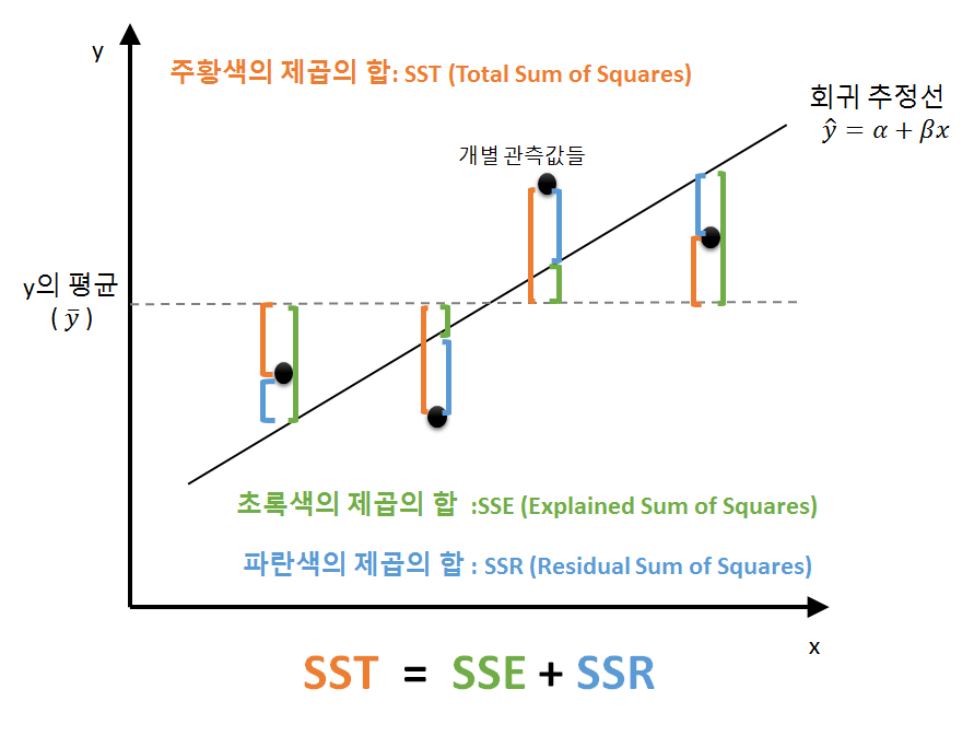 - 총 제곱합 : 관측값들의 총 변동성(SST)