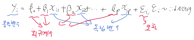 - 일변량 univariate, 다변량 multivariate 회귀변수 : 종속변수(반응 변수)의 개수