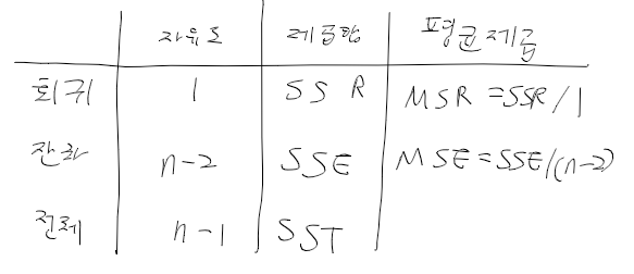 - 이를 토대로 회귀모형 적합도에 대한 가설검정 수행