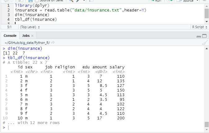 - dim() 함수 : obs 행 와 변수 갯수(열)수 출력